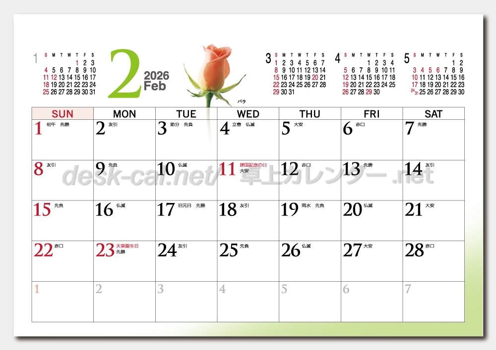 前月、後月3ヶ月掲載。祝日、六曜入り。裏面は1年先まで見れる年表入り。