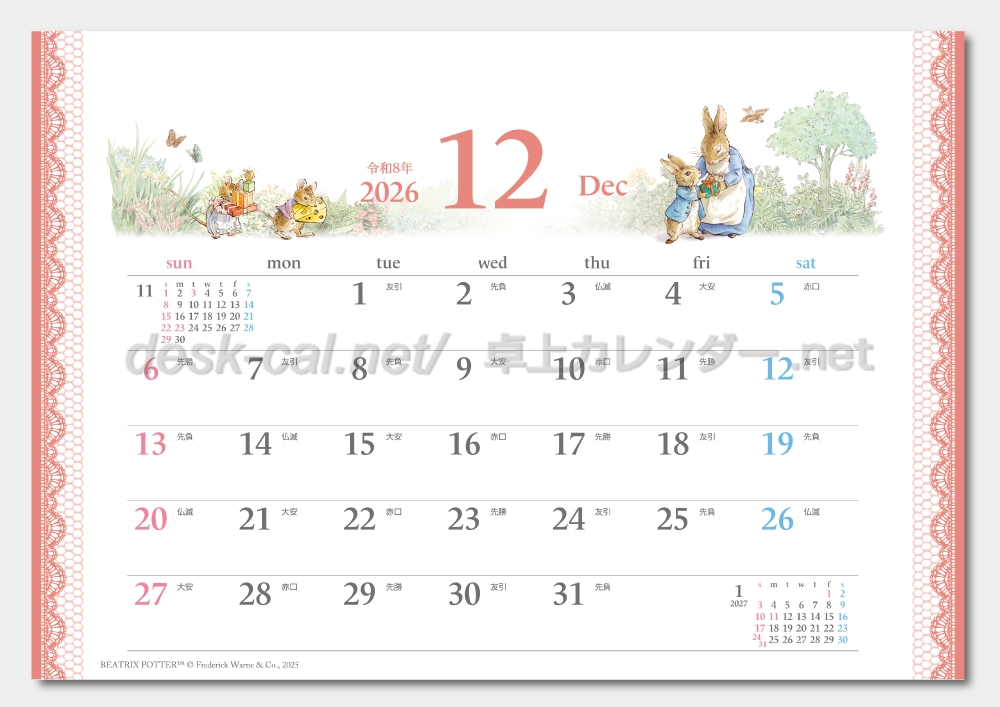 12月の裏面に年表が記載。 台紙がホワイトなのでカラフルな色での名入れ印刷も出来ます。